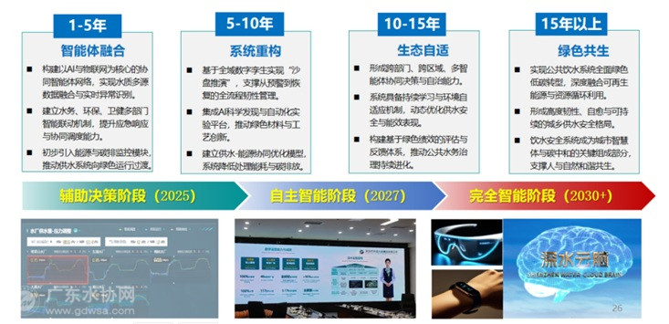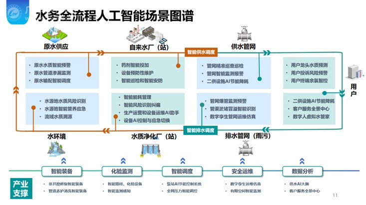 (2)“人工智能+”阶段,生产端先行,首先服务最关键水厂工艺优化、管网压力调控、水质安全预警场景,直接提升系统韧性与快速响应能力。
