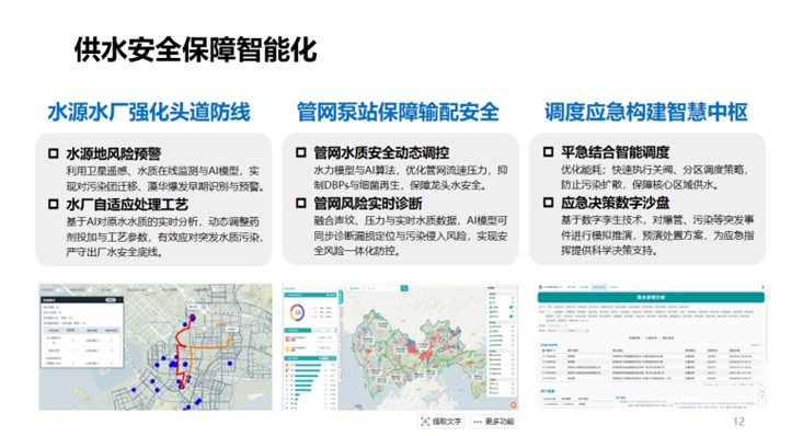 关键数字技术与水务业务深度融合,构建城乡一体化智慧供水安全体系,强化极端天气、污染突发应急调度与协同处置能力。