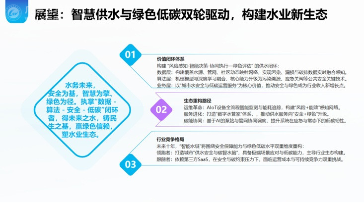 水务未来,安全为基,智慧为擎、绿色为径。执掌“数据-算法-安全-低碳”闭环者,得未来之水,铸民生之基,赢绿色信赖,塑水业生态。