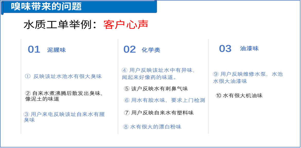 据分析,饮用水中土霉味、淤泥味(主要由土臭素和2-甲基异莰醇导致)、化学品味和氯味为常见的异味投诉类型。高频的嗅味投诉不仅大幅增加客服与处置成本,更持续消耗着用户对供水企业的信任积累,是供水服务质量提升必须攻克的核心堡垒。