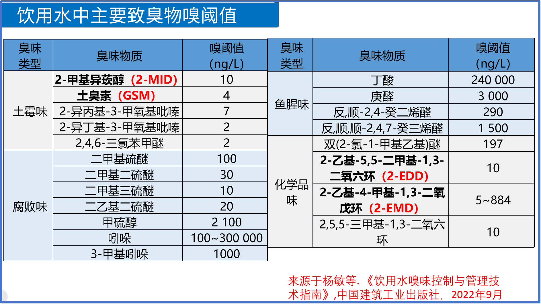人为源/工业源嗅味:主要产生于水源取水、水处理及输配过程。如水源受到化学污染,水处理消毒过程投加的氯,及其与有机物反应生成的氯酚、氯胺等消毒副产物,是自来水“化学品味”、“氯味”、“药水味”的主要来源。管网中铁、锰氧化析出会产生金属味,塑料管材或二次供水水箱涂料可能析出导致“塑料味”、“油漆味”的有机物质。不同的嗅味物质嗅阈值不同,见表1。