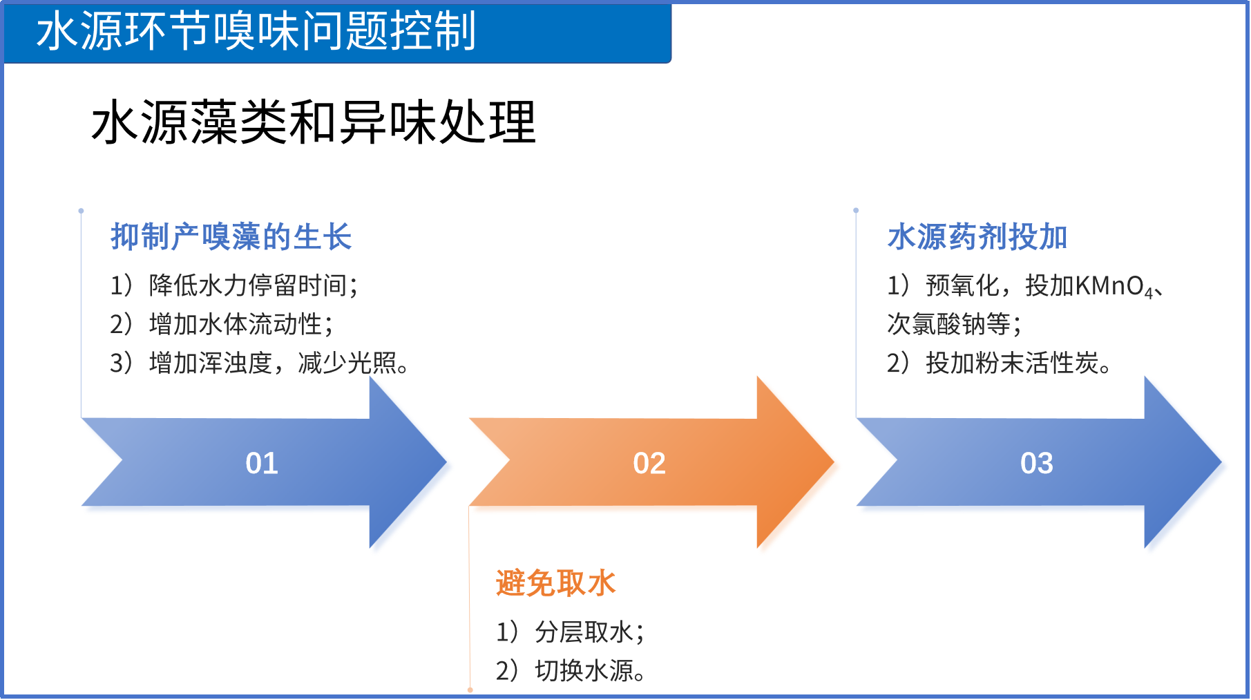 水源环节:取水异味风险。如藻类季节性爆发,工业排放影响,化学品运输泄露风险,或农业面源污染、底泥扰动等均可引入天然或化学致嗅物。