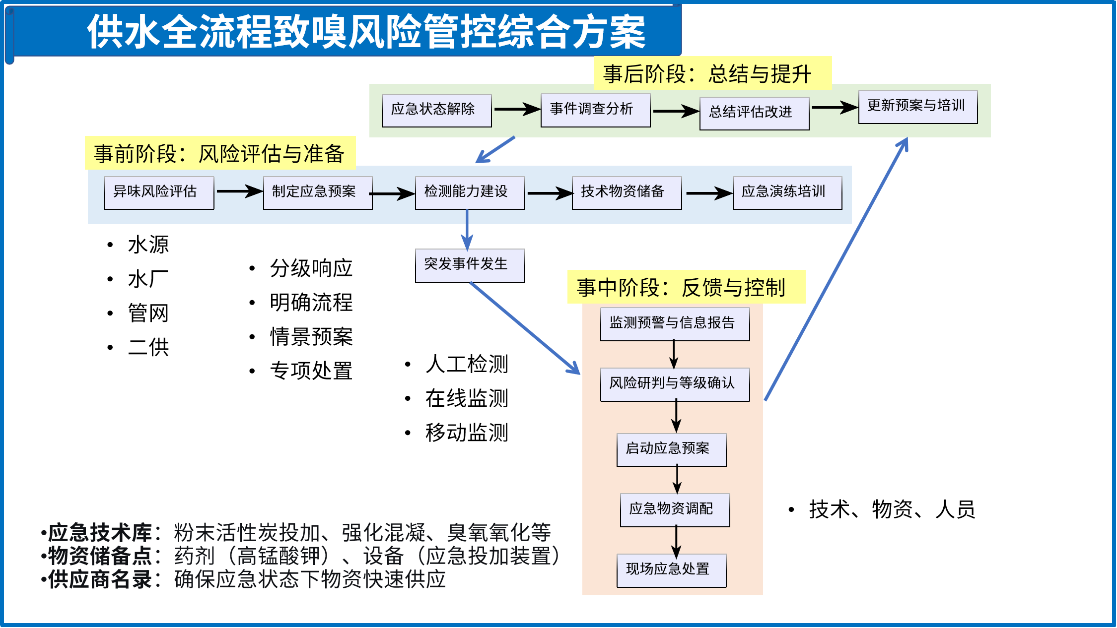 饮用水嗅味风险防控是一项贯穿供水全流程的系统工程。本文系统分析了从源头到龙头的嗅味风险源,重点阐述了如何针对不同风险点,构建以藻类在线监测、有机物在线分析、消毒过程智能控制、管网输配水质在线监控等为核心的“主动预警”技术体系。这一体系的核心价值在于:将风险识别的时空节点大幅前移,将传统的经验判断转化为现代的数据决策,从而为精准、高效的应急处置创造前提。