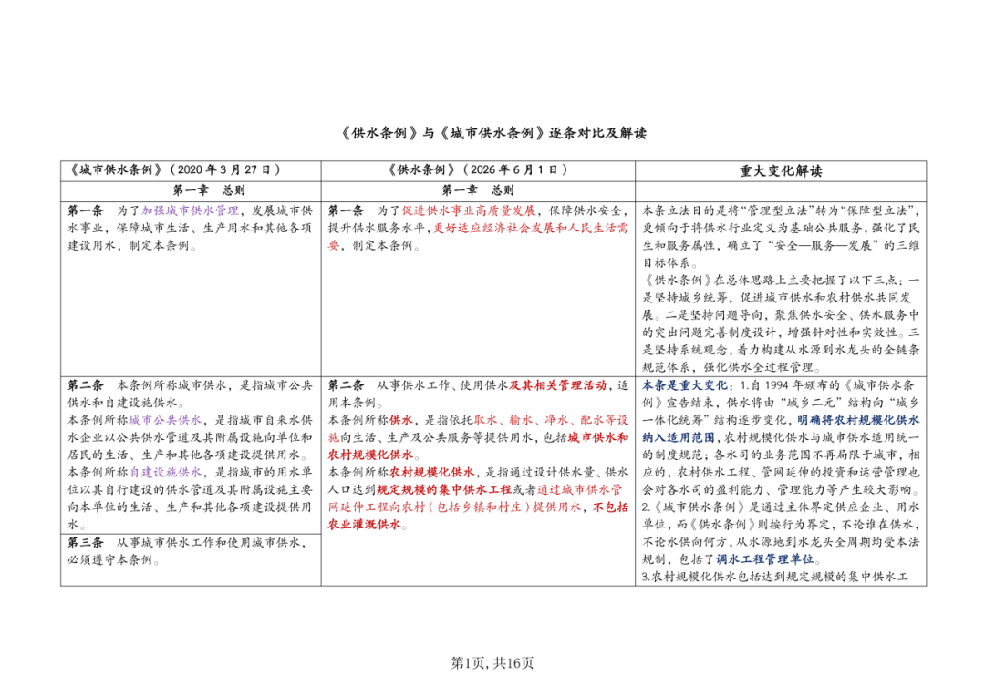 本次对比的旧版文件为1994年发布、2020年修正的《中华人民共和国城市供水条例》(下称“城市供水条例”),新版为2025年12月国务院常务会议通过、2026年6月1日正式施行的《供水条例》(下称“供水条例”)。