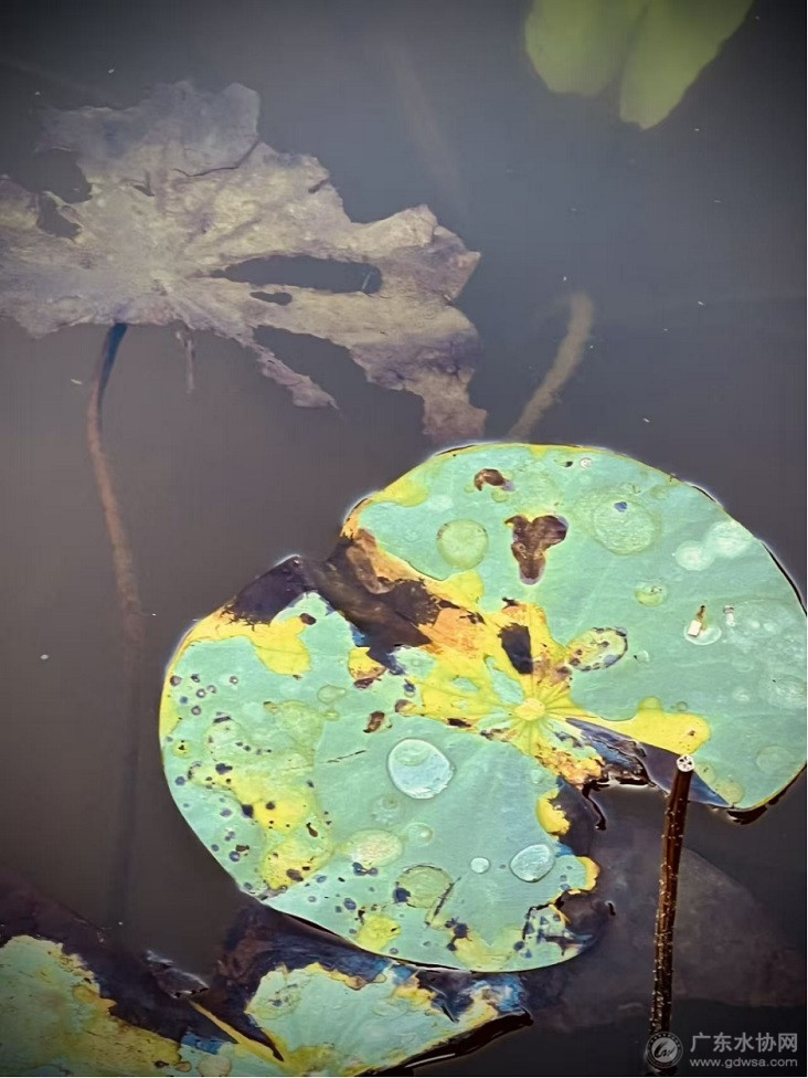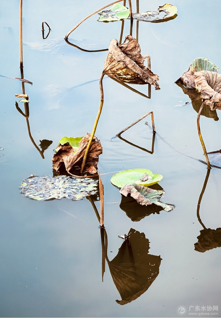 犹记盛夏途经此处,曾见“晨露香荷”的盛景——绿叶接天,红花映日,满湖生机盎然。而今再望,却见荷叶褪去葱茏,有的蜷曲如古铜色的小盏,有的斑驳着黄与褐的印记,静静浮在水面。我轻声叹道:“原来残荷也有这般韵味。”风过枯梗轻晃,似在细数盛夏蝉鸣与此刻湖光,低吟着时光的故事。