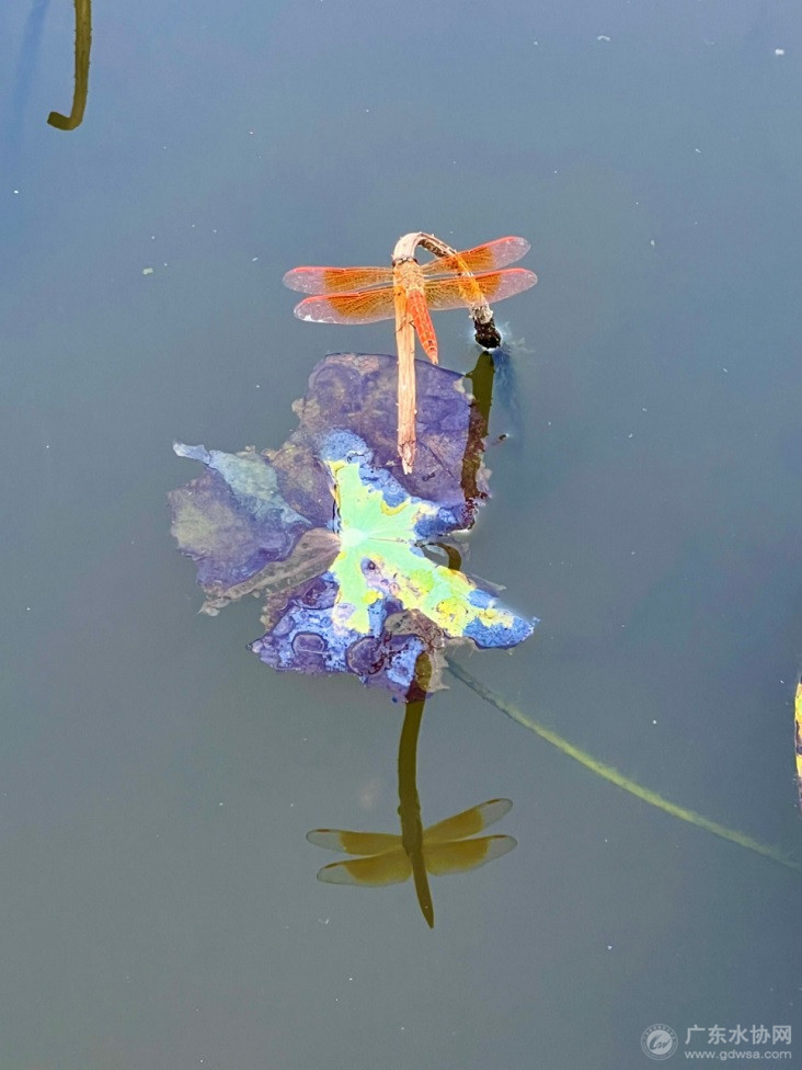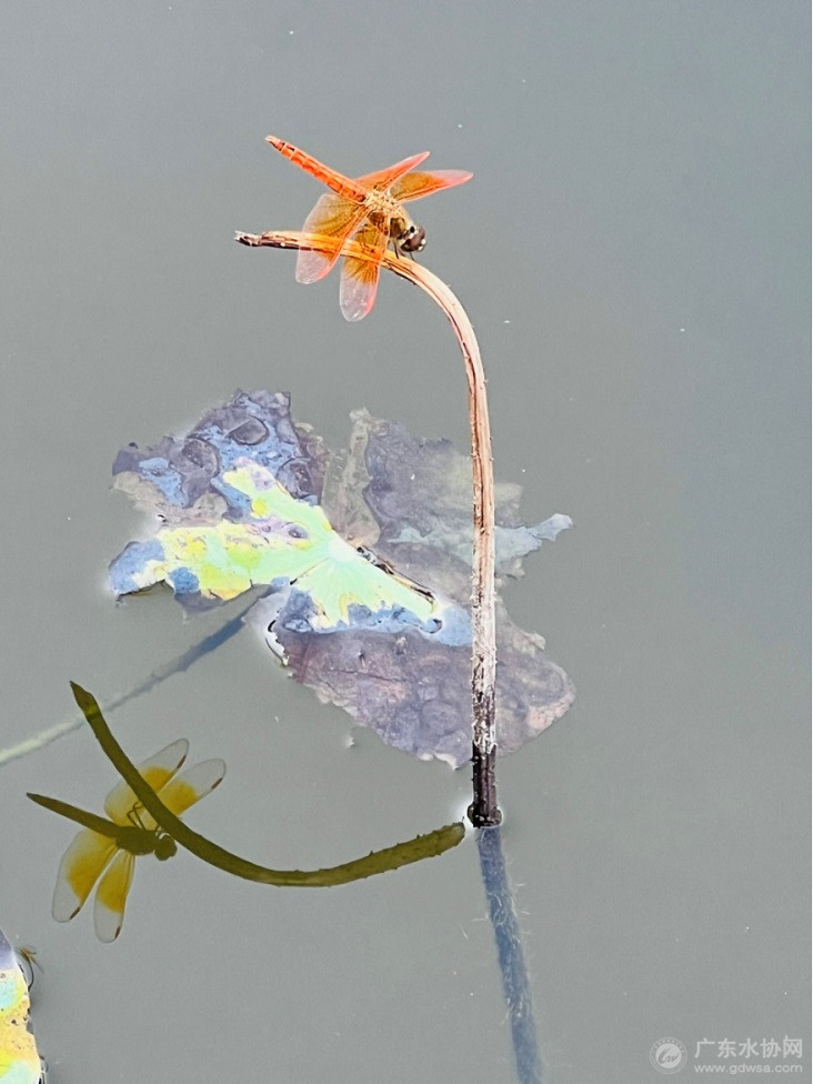 当风掠过水面,枯茎轻晃,红蜻蜓振翅欲飞又落定,水面的倒影随之漾开又重合。这动静之间,残荷的沉静与蜻蜓的灵动,共同编织出秋的诗意。原来,美从不是单一的绽放,更是残缺与生机的对话,是时光在留白处写下的温柔注脚。这般残荷与红蜓的邂逅,何尝不是世间最雅致的风景?