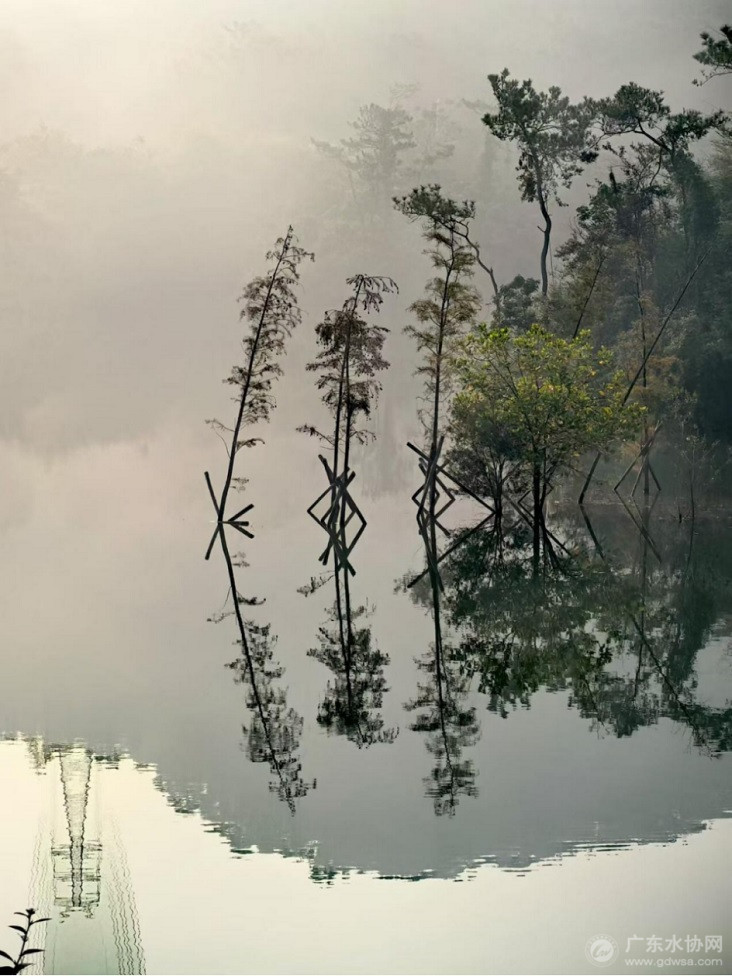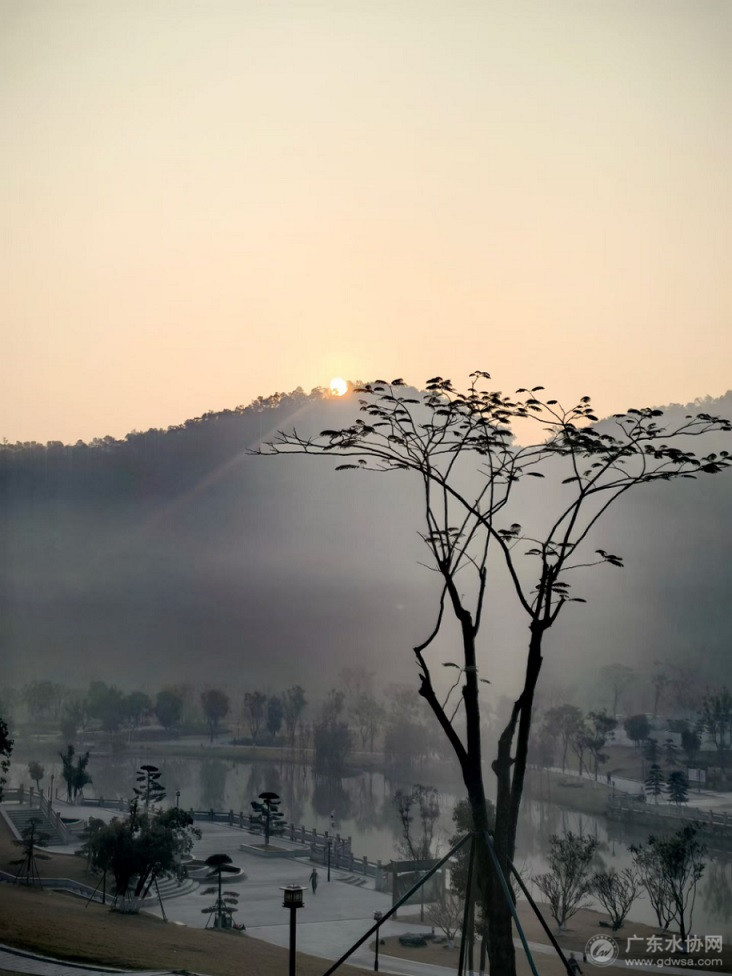 那天一早,天阴沉沉的,像还没醒透。七点钟,我们准时走到金钟湖入口,眼前的湖,已经浸在一片淡淡的雾气里。不是那种浓得化不开的大雾,而是像有人在空气里轻轻晕开了一层墨,把远山、近树、湖面都染成了一幅刚刚落笔的水墨画。