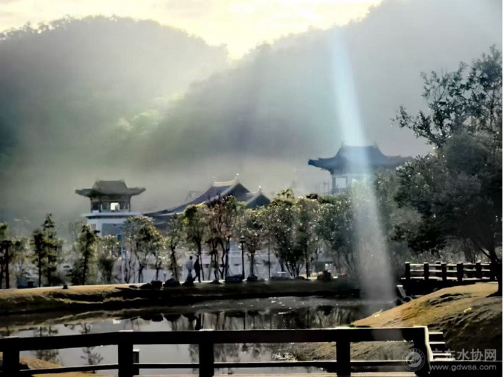 临水的亭台一半藏在雾里,飞檐的线条被雾磨得很柔和。檐角的影子落在水面上,轻轻一晃,就散了。岸边的树枝垂下来,枝头挂着夜里没干的露水,每一根枝条都像蘸了淡墨的笔,在水面上轻轻扫过,留下若有若无的痕迹。我站在亭下,看着这一切慢慢发生,心里很安静,又有一点说不上来的柔软——原来“岁月静好”这四个字,有时就是这样一幅不起眼的小景。
