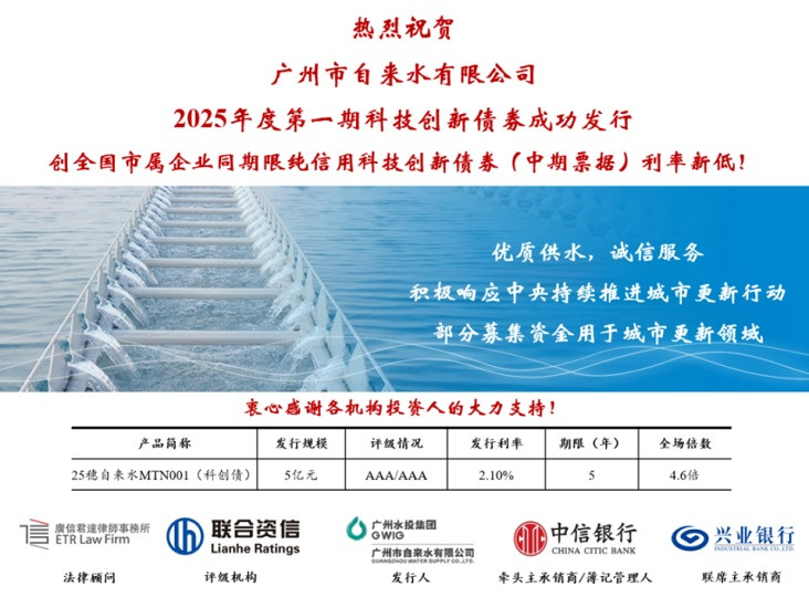 近日,广州水投自来水公司依托高新技术企业的硬实力,成功公开发行2025年度第一期科技创新债券,为公司首次发布5年期公开市场信用债券融资,发行规模为5亿元,票面利率为2.1%,创全国市属企业同期限纯信用科技创新债券(中期票据)利率新低。