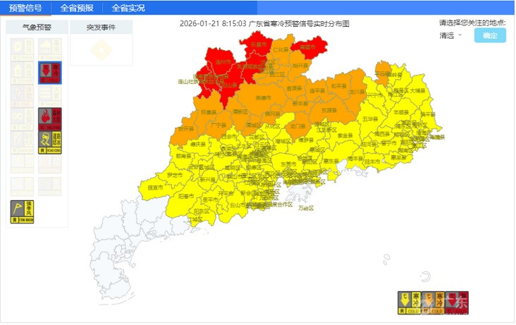 截至1月21日8时15分,广东寒冷预警信号发布情况。广东气象网截图