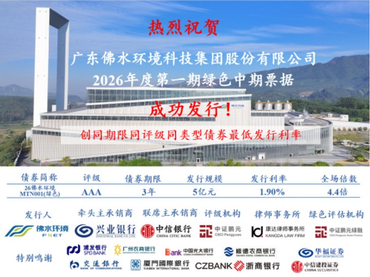 1月23日,广东佛水环境科技集团股份有限公司2026年面向专业投资者的首笔绿色中期票据成功发行。发行规模5亿元,票面利率1.9%,创下同期限同评级同类型债券最低发行利率记录,实现新年“开门红”。