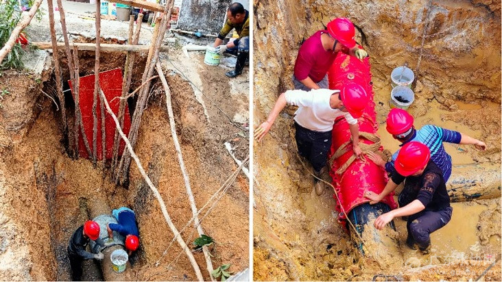 在雨水与汗水交织的现场,抢修人员凭借娴熟技艺与经验,克服视线模糊、作业面湿滑等重重困难,紧密配合,精准完成破损管段的切除、新管件的对接与密封安装。
