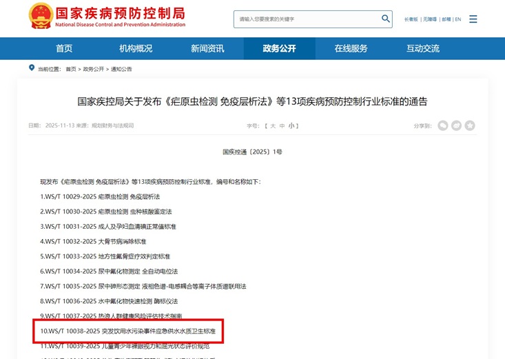 近日,我国首部应急供水水质卫生行业标准《突发饮用水污染事件应急供水水质卫生标准》(WS/T 10038-2025)(以下简称《标准》),经国家疾病预防控制局正式发布。
