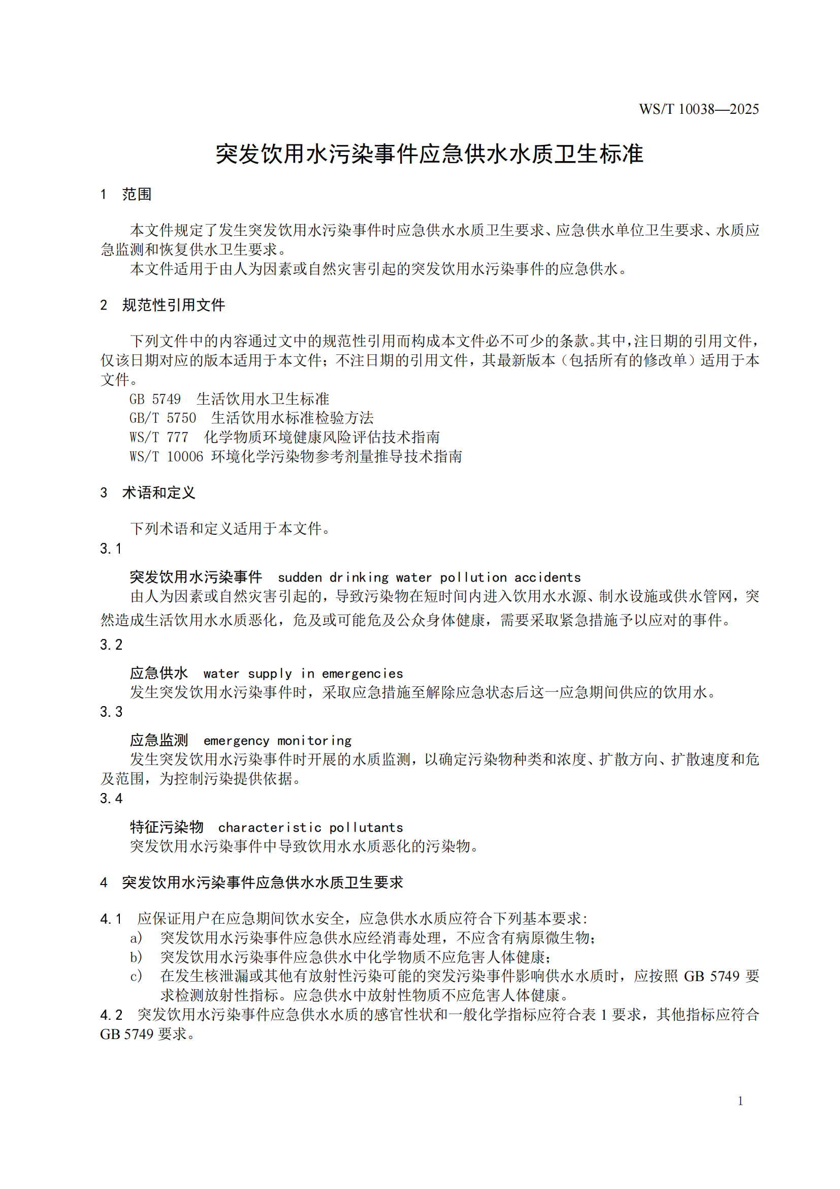 突发饮用水污染事件应急供水水质卫生标准(WS/T 10038-2025)