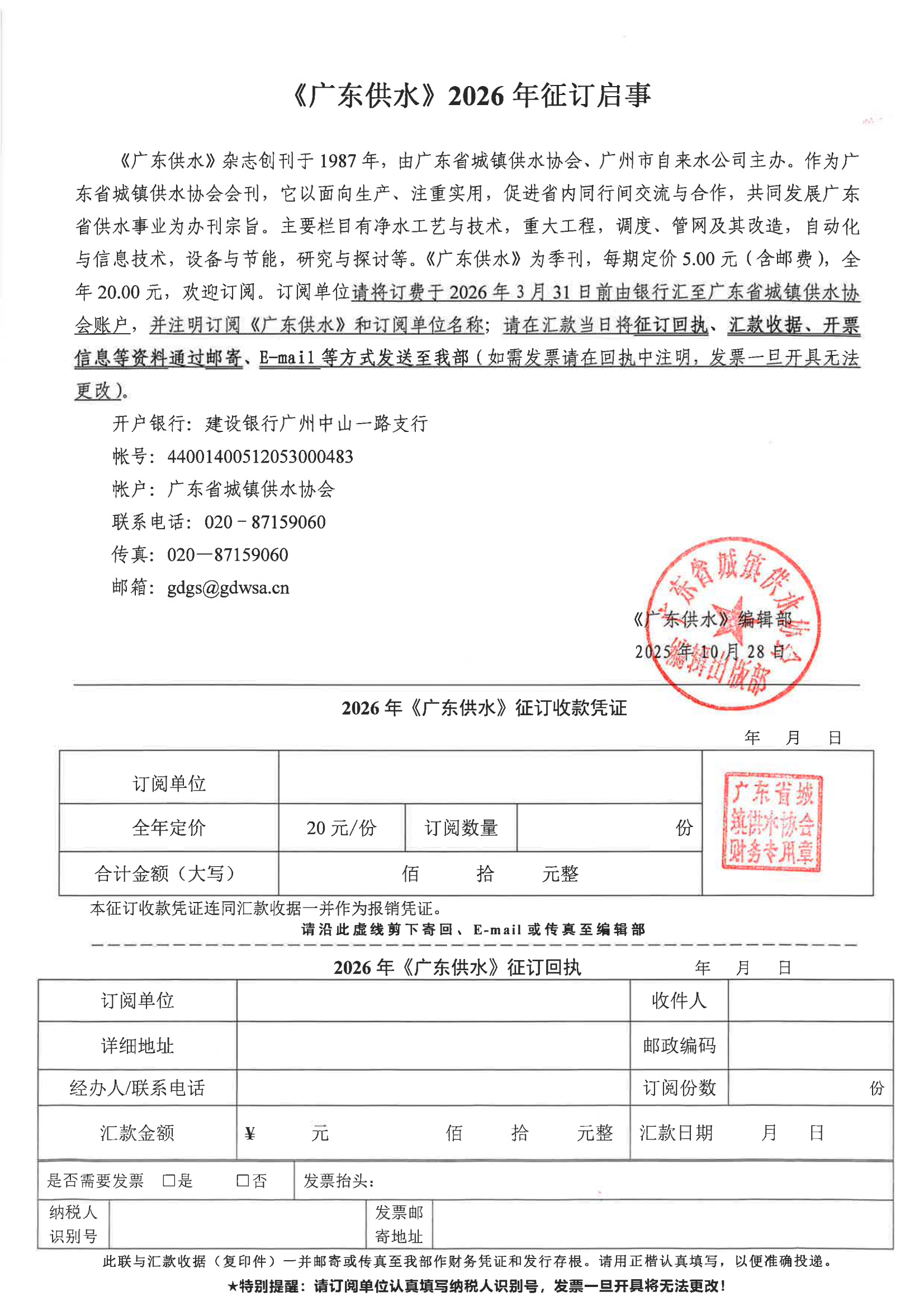 2026年的《广东供水》征订工作正在进行中,为方便各单位获取征订单信息,特在广东省城镇供水协会网站和微信公众号中提供下载。